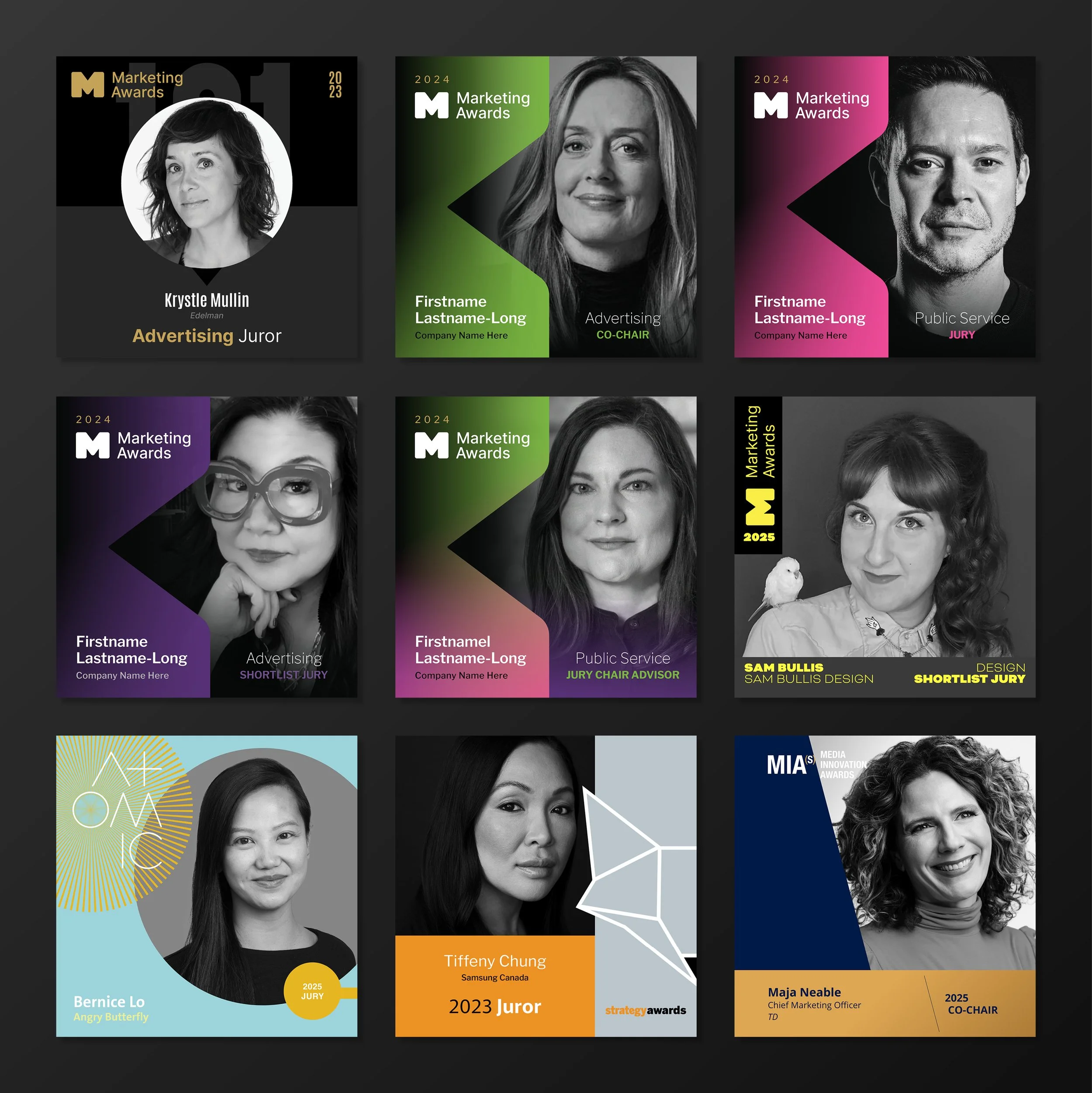 Digital badges for The Marketing Awards, The AToMiC Awards, strategy Awards, and Media Innovation Awards. Layout by Mike Maxam. Design by Mike Maxam and Tim Davin. Art Direction by Tim Davin.